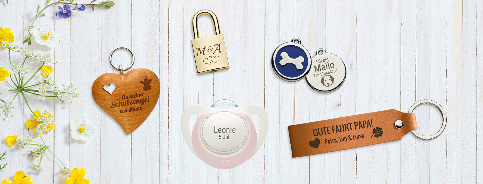 Halten Sie schöne Zitate oder nette Sprüche auf gravierten Schlüsselanhängern von i-Port fest. Überraschen Sie Ihre Liebsten mit einem persönlich gestaltetem Geschenk, wie beispielsweise dem Holzherz oder einem Lederband.